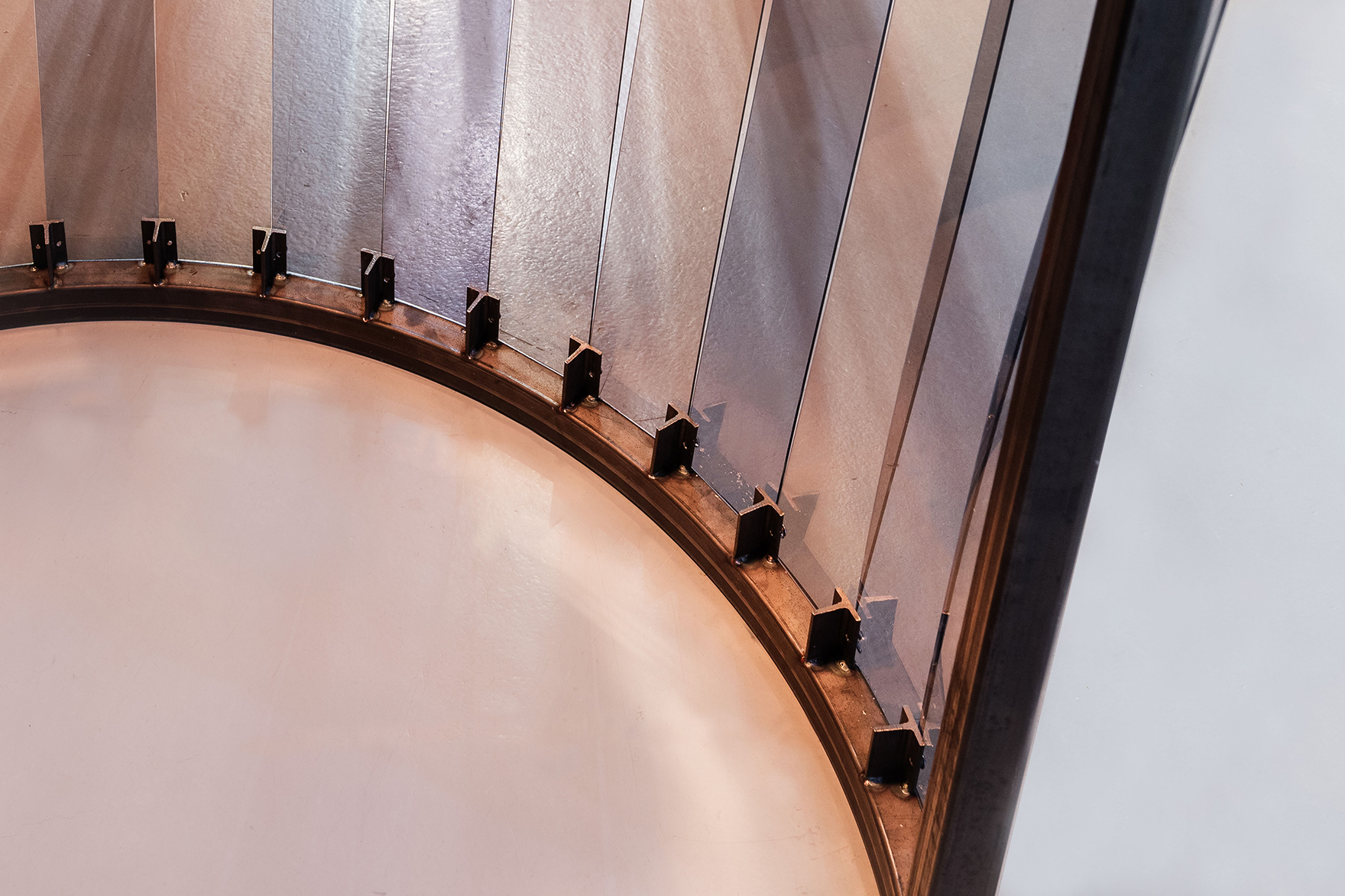 La légèreté des volumes et de la matière constraste avec les structures en acier. Les modules s'entremêlent alors dans un jeu de transparences colorées.
